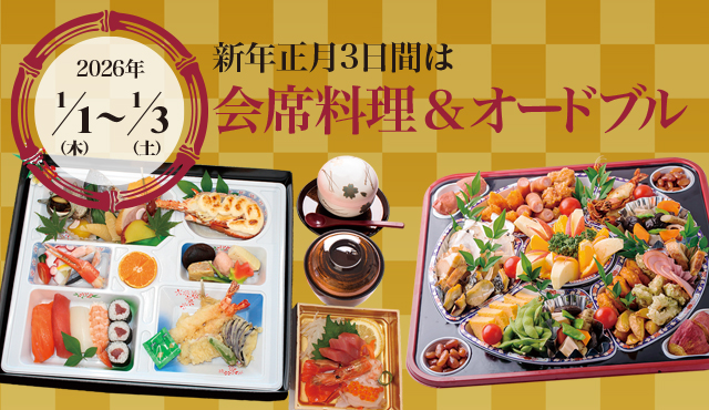 (12月10日(水)までのご注文なら3,000円引き30,000円) ★店頭受け取りで「とらふぐ刺」プレゼント! ■おせち風オードブル【全35品】22,000円(税込)4〜6名様 (12月10日(水)までのご注文なら2,000円引き20,000円) ★店頭受け取りで「とらふぐ刺」プレゼント! ■ミニ三段重【全27品】12,000円(税込)2〜3名様 (12月10日(水)までのご注文なら1,000円引き11,000円) ★店頭受け取りで「清酒200ml」プレゼント! ◎プレミアム付商品券が使えます。11月30日(日)までにご精算ください。 ※ 12月27日(土)〜31日(水)の5日間は、 通常一般予約をお休みとさせていただきます。 新年正月3日間は 会席料理&オードブル ※ 2026年1月1日(木)〜1月3日(土) 新年正月3日間は 会席料理(4,320円・5,400円)と オードブル(3人盛り5,400円・5人盛り 8,640円)と お子様弁当(1,500円・700円)のみの営業 となります。 ※ 1月4日(日)からは 平常通り営業いたします。 |